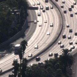 Le survol d’une étendue désertique nous guide vers une rencontre intrigante : une autoroute qui fend le paysage. En son centre, une ligne jaune, ardente, insolente. En remontant ce curieux fil d’Ariane, on trouve des machines qui sillonnent les veines et artères de Los Angeles. Inlassablement, elles peignent et repeignent ces lignes, dans un manège sans fin.